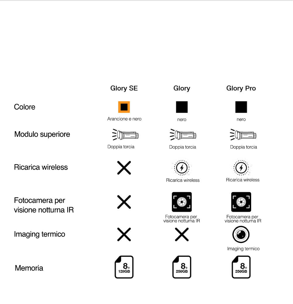 Applicare l’ultimo SO Android 11 per una migliore prestazione. Glory SE 8 GB di RAM, fino a 128 GB / Glory SE 8 GB di RAM, fino a 256 GB/ Glory PRO 8 G+256 G di memoria interna, espandibile fino a 512 GB tramite microSD (non inclusa).